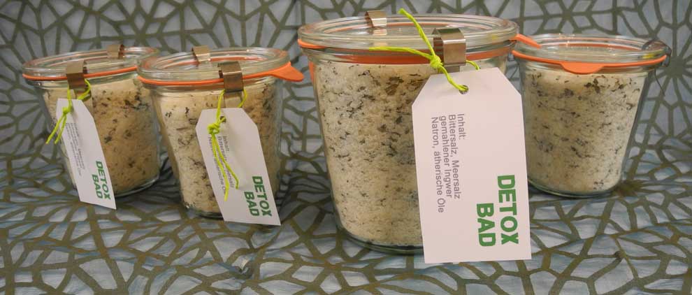 Ein Detox-Bad unterstützt diese natürliche Entgiftungsfunktion. Durch die Osmosewirkung der Salze hilft es der Haut, sowohl Schlacken auszuscheiden als auch Mineralstoffe aufzunehmen. Das in dem Badesalz enthaltene Natron säubert die Poren, der gemahlene Ingwer regt zusätzlich zum Schwitzen an.