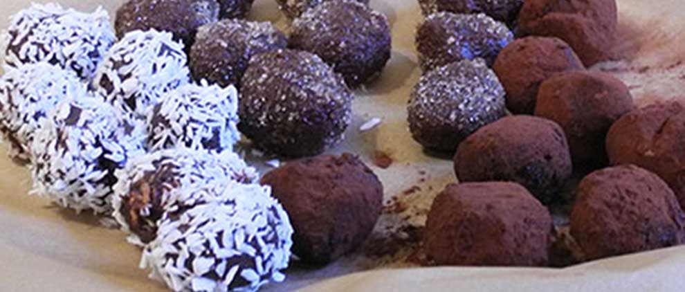 Kleine Kugeln formen, diese in den Kokosflocken, dem braunen Zucker und/oder in dem Kakaopulver wälzen, bis die Oberfläche gleichmäßig bedeckt ist.