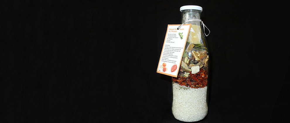 Alle Zutaten nacheinander schichtweise in die Glasflasche füllen. Am besten sieht es aus, wenn der Reis ganz unten liegt. Das Stück Parmesan passt am besten oben drauf.