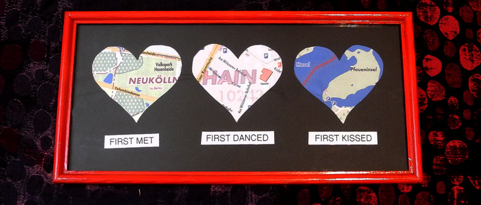 Mit diesem Geschenk habt Ihr den Gipfel der Romantik erklommen, denn dieses DIY Bild hält die ersten wichtigen Stationen Eurer Beziehung fest. Und wie kann man solch ein Bild an Valentinstag wirkungsvoller verschenken als in einem knallroten Bilderrahmen?