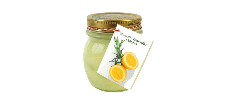 Und hier kommt das perfekte Sommergeschenk: ein Zitronen-Rosmarin Peeling, das die Haut reinigt, pflegt und aktiviert: der Zitronensaft klärt und belebt die Haut, das Rosmarinöl hilft gegen Müdigkeit und fördert die Durchblutung und das Limettenöl komplettiert den erfrischend würzigen Zitrusduft.